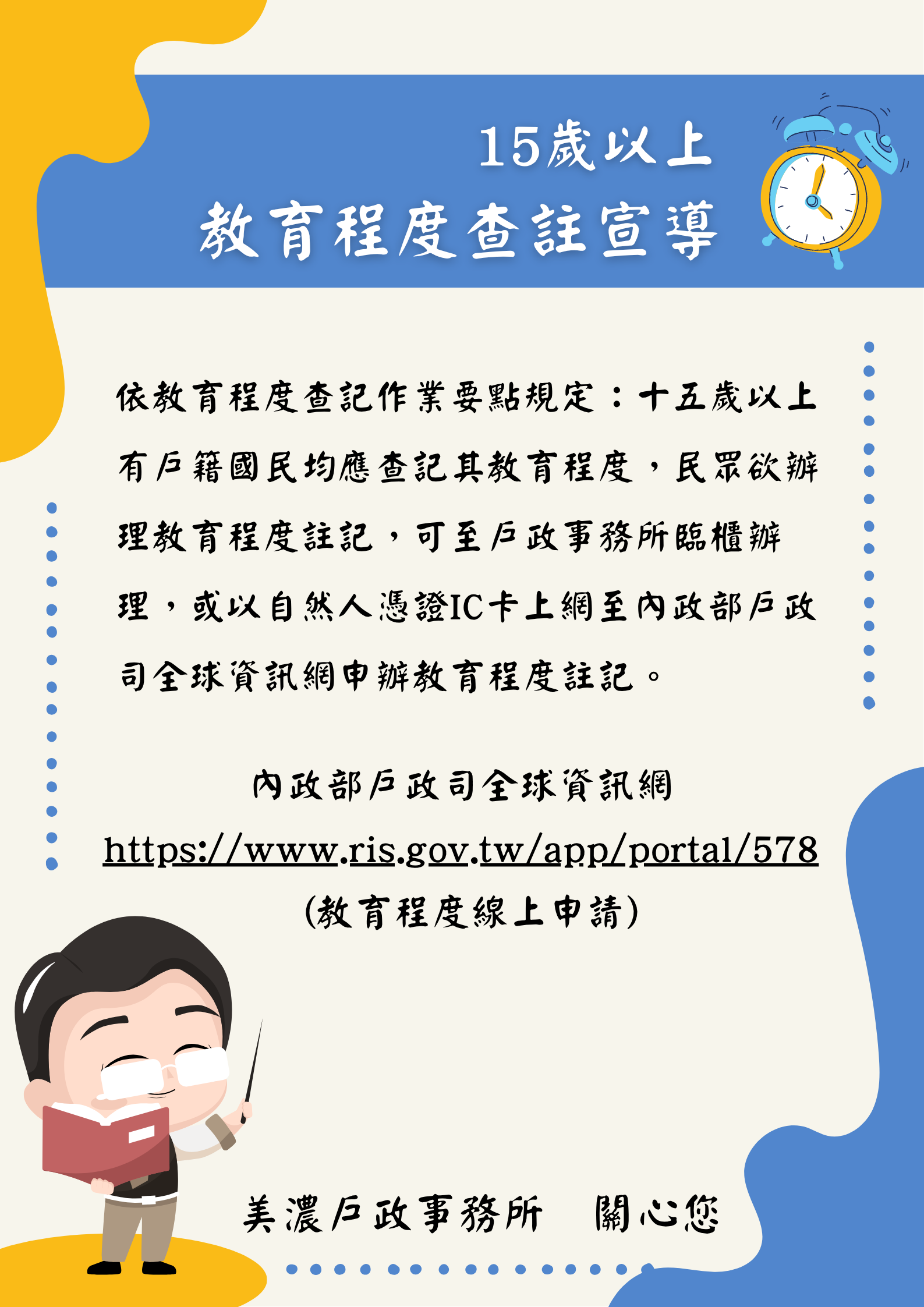 依教育程度查記作業要點規定:十五歲以上有戶籍國民均應查記其教育程度民眾欲辦理教育程度註記,可至戶政事務所臨櫃辦理,或以自然人憑證IC卡上網至內政部戶政司全球資訊網申辦教育程度註記。
